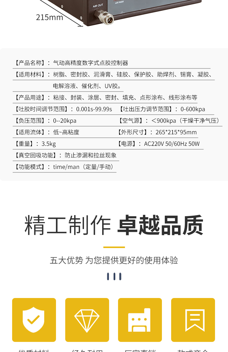 不管您是從事水性液體或濃稠膏狀流體的點膠作業(yè),本控制器都可以大幅度降低您的作業(yè)成本,提高您的產(chǎn)品品質(zhì)、效率以及減少您的流體用量,廣泛應(yīng)用于電子、光學(xué)、包裝、汽車、醫(yī)療、飾品、玩具等領(lǐng)域。