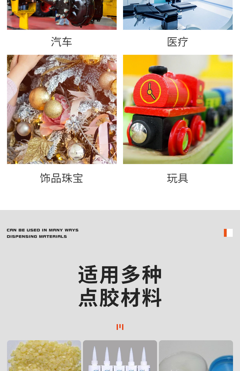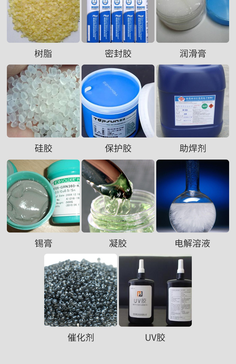 樹脂、密封膠、潤滑膏、硅膠、保護膠、助焊劑、錫膏、凝膠、電解溶液、催化劑、UV膠。