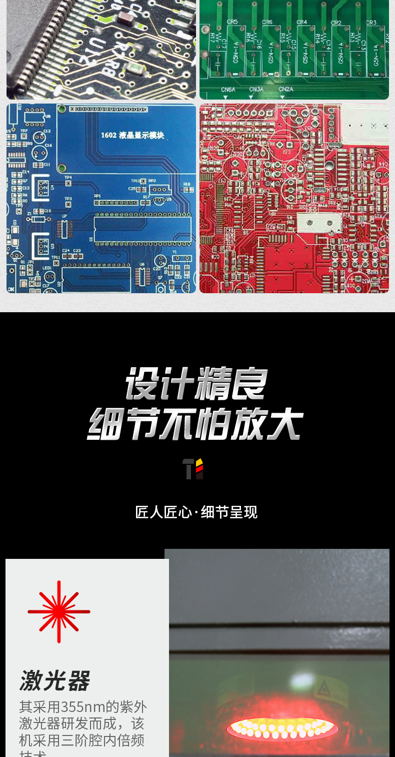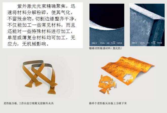 采用UV紫外激光作為工具,冷加工方式,結構緊湊、易安裝、操作簡單,維護方便。幾乎可以加工所有材料,功能強大,精密控制及加工效率極高,是開發創新產品的好幫手。