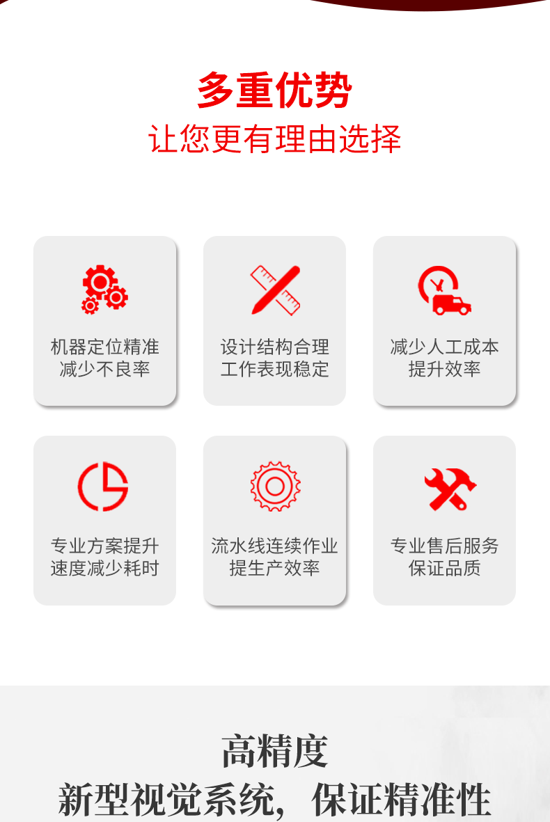3.獨創(chuàng)的新型視覺技術(shù),采用了新型的視覺系統(tǒng)技術(shù),保證點膠過程的精準(zhǔn)性。